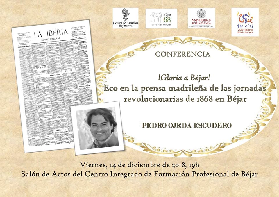 Bajo el título ¡Gloria a Béjar! Ecos en la prensa madrileña de las jornadas revolucionarias de 1868 en Béjar, la conferencia se impartirá en el salón de actos del Centro Integrado de Formación Profesional de Béjar el viernes 14 de diciembre a partir de las 19 horas.