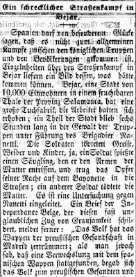 España puede decir que ha tenido especial suerte de que no se haya producido una lucha general entre las tropas reales y la población. Los detalles sobre los enfrentamientos callejeros en Béjar nos proporcionan una imagen de lo que hubiera podido ocurrir. Béjar, una ciudad de 10.000 habitantes en un fértil valle de la provincia de Salamanca, tiene una gran fábrica de textil cuyos trabajadores se habían insurreccionado. Una parte de la ciudad estuvo durante seis horas en poder de las tropas dirigidas por el brigadier Nanetti. Los soldados mataron a ancianos, mujeres y niños. Incluso un soldado ensartó a un bebé que había arrancado de los brazos de su madre y llevó a la víctima de su venganza clavada en su bayoneta por las calles. Otro soldado mató a la madre. Se puso en marcha una investigación contra Nanetti.