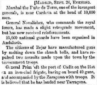 De esa forma, y al abrigo del interés por el movimiento revolucionario que vive toda España, el Daily Evening Telegraph de Filadelfia (EEUU) ya cita a Béjar en una información del mismo 28 de septiembre sobre los levantamientos en varias ciudades, y también lo hace el Birmingham Daily Gazette de Gran Bretaña. Pero más llamativo resulta lo publicado ese mismo día por el también británico Liverpool Mercury que, citando entre otras fuentes a la Agencia Reuters y a La Gaceta de Madrid, describe cómo “los ciudadanos de Béjar han construido armas fundiendo las campanas de las iglesias, y han rechazado dos veces el asalto de las tropas gubernamentales”[3]. Lo que no deja de resultar increíble si se tiene en cuenta que el enfrentamiento armado se produjo ese mismo día 28.