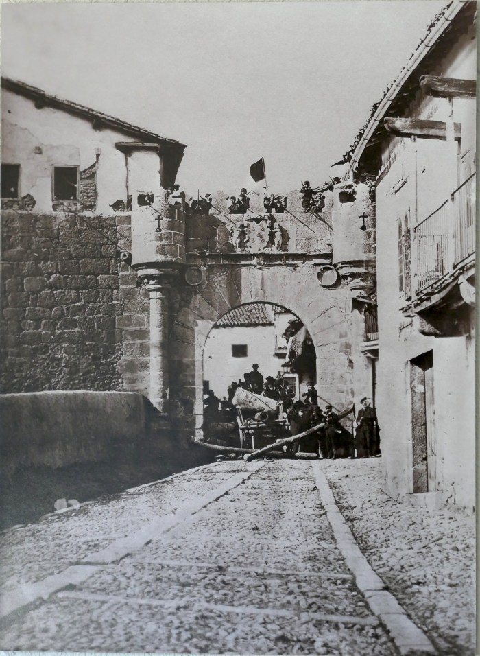 Pie de foto: La más famosa fotografía de Juan Cambón en Béjar, la Puerta de la Villa en los acontecimientos de 1868.